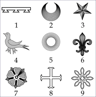 Charges used as marks of cadency in English heraldry: 1: label of three points; 2: crescent; 3: mullet; 4: martlet; 5: annulet; 6: fleur-de-lys; 7: rose; 8: cross moline; 9: octofoil