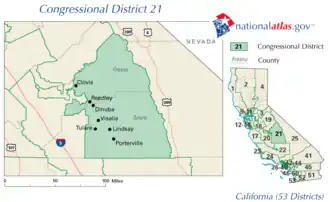 California's 21st congressional district (or CA-21) is a congressional district in the U.S. state of California. It is located in the San Joaquin Valley and includes parts of Fresno County and Tulare County. Cities in the district include the majority of Fresno, the north side of Visalia, and all of Sanger, Selma, Kingsburg, Parlier, Reedley, Orange Cove, Dinuba, Orosi, Cutler, Farmersville, Woodlake and Exeter.[3] The district is currently represented by Democrat Jim Costa.