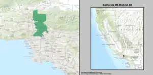 Los Angeles County is split between this district, the 23rd district, the 30th district, the 31st district, the 34th district, the 35th district, and the 38th district. The 28th and 23rd are partitioned by Angeles National Forest and Juniper Hills Rd.