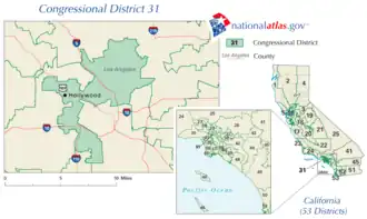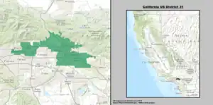 California's 31st congressional district is a congressional district in Los Angeles County, in the U.S. state of California. The district is located in the San Gabriel Valley and contains most of the Hispanic-majority areas in that region.