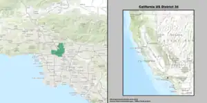 California's 34th congressional district is a U.S. congressional district in California. Located in Los Angeles County, the district is represented by Democrat Jimmy Gomez. Its previous U.S. representative, Democrat Xavier Becerra of Los Angeles, resigned January 24, 2017, to become attorney general of California. Representative Gomez won a special election on June 6, 2017, beating fellow Democrat Robert Lee Ahn to replace Becerra.[3] He was later sworn in as the district's U.S. representative on July 11, 2017.[4]