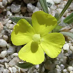 Camissoniopsis pallida is a low growing, yellow-flowered annual plant in the evening primrose family, Onagraceae.[2]: 238  It is known by the common names pale primrose[2]: 238  or pale yellow suncup. It is native to the desert and scrub habitat of the region where Arizona, California, and Nevada meet. It is a roughly hairy annual herb growing in a low patch on the ground, sometimes producing an erect stem from the basal rosette. The herbage is gray-green to reddish green. The leaves are lance-shaped and up to 3 centimeters long. The nodding inflorescence produces flowers with yellow petals 2 to 13 millimeters long, each with small red markings near the bases. The fruit is a straight to tightly coiled capsule.