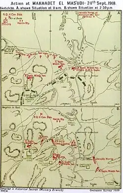 At Beisan, the 4th Cavalry Division was well in advance of their rations transport, which did not catch up until the next day, when lorries delivered rations. Until then, the division had the remains of their two days' special emergency ration, which had been carried in sandbags on their saddles.[52][53] Ration transport had been 50 miles (80 km) behind the division; 'A', 'B' Echelons, the Divisional Transport Train, and Ammunition Column bivouacking for the night at Shellalif on 19 September. The special camel convoy had been unable to keep up, and its provisions were distributed elsewhere. By the evening of 20 September rations had also been delivered to the 5th Cavalry Division at Aujah by motor lorry via the Musmus Pass, while 'A' Echelon and the Divisional Transport Train were bivouacked at Qaqun.[53]
