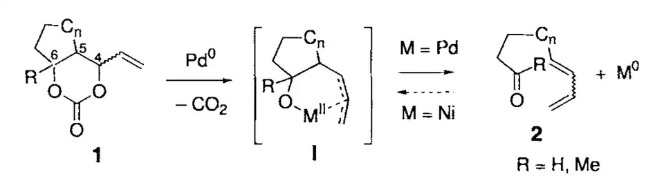 In 1997, Tamaru group reported the first metal-catalyzed β-carbon elimination of an unstrained compound.[9] Their work revealed a novel Pd(0)-catalyzed ring opening of 4-vinyl cyclic carbonates. They proposed that the reaction is initiated by the elimination of carbon dioxide to form π-allylpalladium intermediate, which is followed by β-decarbopalladation to form dienals and dienones. Since then, this field has bloomed, and a lot of similar reactions were developed and showed their great potential in organic synthesis. The early stage of research in this field has focused on the reaction of M–O–C–C species and β-carbon elimination of the M–N–C–C intermediate was not discovered until the recent ten years. In 2010, Nakamura reported a Cu-catalyzed substitution reaction of propargylic amines with alkynes or other amines as the first example of the transition-metal-catalyzed β-carbon elimination of amines.[10]