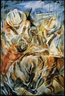 Enriquez returned to Cuba in 1934, and began developing a new pictorial style, which became his trademark. He named it romancero guajiro (countryman's romance), a modernist approach to the stories and colors of the Cuban countryside. As with the other vanguardia artists, re-encountering his native land provided the catalyst for his mature style and his commitment to the expression of Cuban social realities and popular myths. One of his preoccupations as an artist concerned the expression of an authentic Cuban-Caribbean culture, which he believed was only to be found in the countryside, in its Creole people, myths, and legends.[2] Enríquez's romancero guajiro was strongly influenced by some of the core ideas of modernist primitivism. His primitivism, however differs from that of Antonio Gattorno and Eduardo Abela in that it does not represent the guajiros as simple, calm, and noble, but rather as raw, violent, and restless. His painting Rey de los Campos de Cuba (King of the Cuban Fields) received first prize in 1935's National Exposition of Painters and Sculptors.