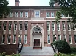 The University of North Carolina at Chapel Hill named the building after William L. Saunders in 1922, thirty years after his death. The university named the building Saunders Hall in order to commemorate William L. Saunders' service as a confederate colonel, state secretary of state, and as "Head of the Ku Klux Klan in North Carolina."[1] Saunders Hall was built in the main quad of the University of North Carolina at Chapel Hill campus and remained there for 93 years.[2] In 2014, university students asked trustees to rename the building due to Saunders' role as a Ku Klux Klan leader.[3] Many asked to change the name to "Hurston Hall" to honor Zora Neale Hurston.[4] The Board of Trustees passed a resolution to rename the building, with 10 of the 13 trustees voting for the resolution.[5] In May 2015, the university announced that the building would be renamed "Carolina Hall",[4] and it was officially renamed on August 13, 2015.[6] The Board of Trustees also formulated a plan to forbid any name changes to other buildings on campus for sixteen years.[7]