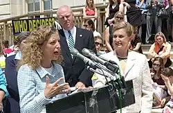 Maloney has been active on many other issues involving women, children and families since the beginning of her career.[12] A former co-chair of the House Caucus on Women's Issues, she authored and helped secure the enactment into law of a measure to provide federal funding to clear the backlog of rape kits for which evidence had been collected, but never entered into law enforcement DNA databases. The Rape Abuse and Incest National Network called it "the most important anti-rape legislation ever considered by Congress".[103] Maloney's bill, included in the Justice for All Act of 2005, was named the Debbie Smith Act in honor of Debbie Smith, a rape survivor. The effort to enact the bill was later the subject of a Lifetime Television movie, A Life Interrupted: The Debbie Smith Story,[104] in which Maloney was played by Lynne Adams. Maloney also co-authored and helped secure passage of bipartisan legislation to curb the demand for sex trafficking.[105]