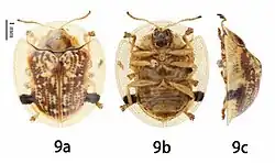 Adults have an elliptical body. The elytral disc is dark brown, interspersed with prominent pale yellow spots.[1]