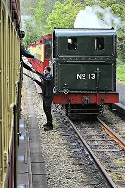 On the rear goods siding, one of the railway's three breakdown cranes was stored for a number of years, being removed in 1991 and subsequently restored and placed on display at Union Mills on the site of the former railway station. This crane was constructed in 1893 by the Birmingham-based firm Richard C. Gibbins. Inside the station's waiting room are several framed displays charting various historical aspects of the railway featuring old photographs, framed tickets, maps and other historical documentation relating to the earliest days of the railway. A headboard commemorating the centenary of the adjacent Poulsom Park in 1996 is also mounted on the wall above the fireplace, several other pieces of ephemera are available to view at the station. For many years, there also featured large advertisement hoardings lining the down platform but these were removed in 1974 having become unsafe. An original signal windlass constructed by the Birmingham company A.J. Linley & Co., was also displayed on the up platform for many years, a similar version is extant and used to operate the unique slotted post semaphore signal which protects the station's southerly side.