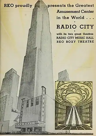 The Center Theatre was originally called the RKO Roxy Theatre and built as part of the construction of Rockefeller Center. The RKO Roxy started construction in November 1931,[2] and it opened December 29, 1932 with the RKO film The Animal Kingdom and a live stage show. It was intended as a smaller sister to the 6,000 seat Radio City Music Hall one block away, which at first did not show films. The smaller theater was named after producer Samuel L. Rothafel, aka "Roxy", who was engaged by Rockefeller Center to supervise the design and operation of the two theaters.[3][2] After the initial failure of the Music Hall in its first weeks, Rothafel suffered a heart attack and never returned to his new theaters. A successful lawsuit in 1933 by the owners of the original Roxy Theatre on Seventh Avenue, claiming ownership of the "Roxy" name, caused the new theater to be renamed the RKO Center.