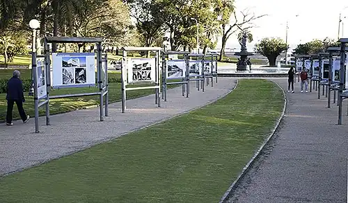 The twelve open-air exhibition spaces in the Montevideo neighborhoods of Parque Rodó, Prado, Ciudad Vieja, Goes, Peñarol, Unión, Casavalle, Espacio de Arte Contemporáneo, Plaza Cagancha, Capurro, Santiago Vázquez, and Parque Batlle present changing shows of photographs many of which are chosen each September by a panel of three judges from open submissions.[7] [8] Each exhibition consists of eighty or more weather-resistant digital prints mounted on 1 meter by 1.5 meter aluminum panels attached to welded-steel frames. The exhibitions are in public parks and pedestrian streets and are open every day of the year and also at night as the frames are illuminated. One rationale for the open air exhibitions is that they bring foot traffic to previously unfrequented public areas that might otherwise seem dangerous, especially at night.[9] These exhibitions have included a retrospective of the architecture of Óscar Niemeyer, Views of Paris (André Kertész, Marcel Bovis, Eugène Atget), the 2012 London Olympics by Agence France-Presse, and the work of individual photographers such as Sebastián Szyd, João Marcos Rosa, Nacho Seimanas, Laura D'Andrea, Marcelo Isarrualde, Andrea López,[5] and Mayeli Villalba.[10]