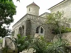 It was built by a German in the early 1940s[1] and consists of a main building and a tower. The building is owned by the Togolese government and is used for cabinet meetings. It had already been used for meetings during the reign of Gnassingbé Eyadéma. Much to the displeasure of the surrounding population of Kouma-Konda, over whom a curfew was imposed when Eyédama received state guests.[2] In the past presidents such as François Mitterrand, Félix Houphouët-Boigny and Abdou Diouf have stayed at the chateau, as well as the German CDU Chairman Franz Josef Strauss.[3] It underwent renovation in 1979.[4]