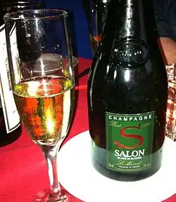Champagne Salon was founded by Eugène Aimé Salon in the early 20th century. Salon was convinced that the Chardonnay grapes from the Le Mesnil-sur-Oger vineyards could produce wine with favorable levels of finesse and elegance without the need to add Pinot noir or Pinot Meunier. Around the turn of the 20th century, Salon began producing a Chardonnay-only cuvée that he shared privately with friends.[2] The first commercial vintage of Champagne Salon was in 1921 and by 2006, the house has released only 37 vintages under the Salon label.[3] Following Eugène Aimé Salon's death in 1943, his sister inherited the company which was eventually sold to Laurent-Perrier in 1989.[4] Since then, Salon is effectively part of the combined Salon-Delamotte house.