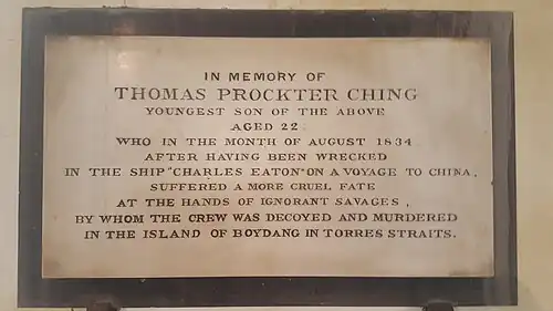 Charles Eaton was a barque, launched in 1833 for use as a merchant ship. Whilst under the command of Captain Fowle, she was wrecked in 1834 among the Torres Strait Islands, off the northern coast of Queensland, Australia, and her passengers and crew attacked and nearly all killed by Torres Strait Islanders on Mer Island. A cabin boy and small child survived and lived with the islanders until being rescued by Captain Lewis and crew on Isabella in June 1836, who also found skulls of some of the murdered people on a nearby island and took them back to Sydney for burial.