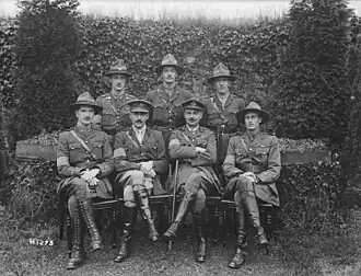 In England attending the Staff College at Camberley when the First World War broke out, Melvill returned to his former unit, the South Lancashire Regiment.[2] He embarked for the Western Front in August as part of the "Old Contemptibles" and was wounded the following month. After recovering from his wounds, he was posted to the School of Instruction, Westminster Command, as chief instructor. He then served as brigade major for the Tay Defences from May to September 1915 before transferring to the New Zealand Expeditionary Force (NZEF), which at the time was engaged in the Gallipoli campaign.[1] Initially a staff officer, he served under Brigadier General William Braithwaite as brigade major of the New Zealand Rifle Brigade following the evacuation of the Allied forces from Gallipoli in December.[1][4][8]