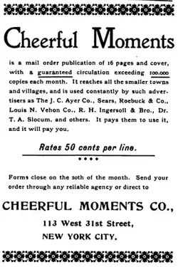 Cheerful Moments was an American monthly mail-order magazine from 1892 until 1908, primarily a vehicle for advertising and light stories of the day, and one of a number of similar publications.