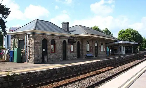 The single-storey buildings on the Gloucester/Birmingham side of the line are stone and timber-built structures, in an Italianate style. They were completed in 1850 for Isambard Kingdom Brunel's South Wales Railway, and according to architectural historian John Newman were designed by N. Lancaster Owen.[3] A canopy provides shelter. On the more popular Newport/Cardiff side, there is just a small modern shelter.