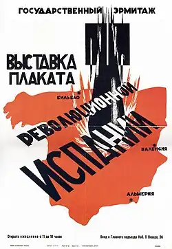 Announcement of an exhibition with posters supporting the Spanish Republic in the Hermitage Museum in Saint Petersburg.