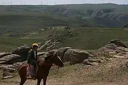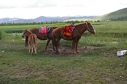 The Chinese Mongolian horse is primarily utilized for riding and the production of mare's milk in Inner Mongolia, where mares are typically milked five times a day.[10] Record milk production during a single lactation can exceed 300 to 400 kg.[9] The meat from these horses can be eaten, representing a vital product for the nomadic population.[10] In other provinces, Chinese Mongolian horses are also used as packhorses,[12] noted for their ability to carry heavy loads while foraging for their food.[9]