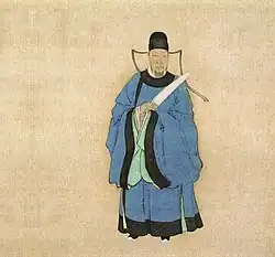 Cizang (慈藏), a Silla monk, studied Vinaya in China and when he returned to Silla, he promoted Dharma in 643.[9] Cizang also contributed to the change of Silla's imperial or official dress for the customs of the Tang, which also marked the beginning of Chinese clothing rituals in Silla.[9] During the reign of Queen Jindeok, Kim Chunchu adopted the Tang dynasty dress and encouraged the Silla kingdom to adopt Chinese administrative practices.[10] The danryeong was thus introduced from the Tang dynasty by Kim Chunchu in the second year of Queen Jingdeok's rule.[11]