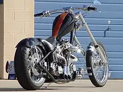 A chopper is a type of custom motorcycle which emerged in the US state of California in the late 1950s. A chopper employs modified steering angles and lengthened forks for a stretched-out appearance. They can be built from an original motorcycle which is modified ("chopped") or built from scratch. Some of the characteristic features of choppers are long front ends with extended forks often coupled with an increased rake angle, hardtail frames (frames without rear suspension), very tall "ape hanger" or very short "drag" handlebars, lengthened or stretched frames, and larger than stock front wheel. To be considered a chopper a motorcycle frame must be cut and welded at some point. I.e. the name chopper.[1] The "sissy bar", a set of tubes that connect the rear fender with the frame, and which are often extended several feet high, is a signature feature on many choppers.