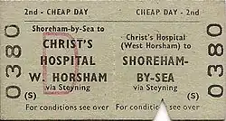 The station opened on 28 April 1902,[33][34][35][36] although the official ceremony took place on Thursday 1 May 1902.[31] The station was initially known as Christ's Hospital (West Horsham), but when tickets were issued to travel to Christ's Hospital school for its opening ceremony on 29 May 1902, they were made out to Stammerham Junction.[31] Special trains bound for the school departed from London Victoria at 1520, London Bridge at 1525 and Sutton at 1540, all due to arrive at Christ's Hospital at 1645.[31] Some of the schoolmasters were dispatched to Victoria and London Bridge to meet the pupils.[31]