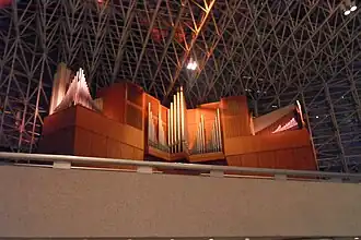 Christ Cathedral is home to the Hazel Wright Organ, the fifth largest pipe organ in the world,[5] It was constructed by the firm Fratelli Ruffatti in Padua, Italy, based on specifications provided by the organists Virgil Fox and Frederick Swann. Swann served as the organist at the Crystal Cathedral from 1982 to 1998. The Hazel Wright Organ has 273 ranks and five manuals. It incorporates the large Aeolian-Skinner pipe organ built in 1962 for New York's Philharmonic Hall along with the smaller Ruffatti organ that was installed in the original Garden Grove church.[5]