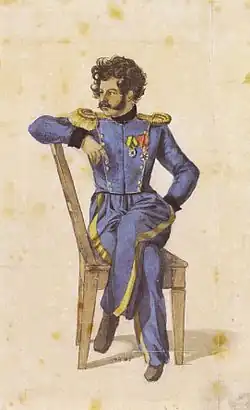 Christian Wilhelm von Faber du Faur (18 August 1780 in Stuttgart – 6 February 1857 in Stuttgart) was a painter and an officer in the army of the Kingdom of Württemberg. He first devoted himself to painting, but subsequently became a soldier, and as a lieutenant in the 25th Division (the Württemberg unit) of the III Corps of Napoleon's Grande Armée, served in the French invasion of Russia, which he sketched as it progressed. His sketches were exhibited in 1816, and subsequently he used them to produce color plates, and then in 1831–44 published some of them, with text, in a work entitled Blatter aus meinem Portefeuille im Laufe des Feldzugs 1812. His most noteworthy paintings are The Passage of the Beresina, a work of great merit, and The Coffee-House at Wilna. He attained the rank of general in 1849.
