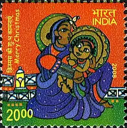 A Christmas stamp is a postage stamp with a Christmas theme, intended for use on seasonal mail such as Christmas cards. Many countries issue such stamps, which are regular postage stamps (in contrast to Christmas seals) and are usually valid for postage year-round (in some countries they have a discounted value and are for use exclusively on Christmas cards). They usually go on sale some time between early October and early December, and are printed in considerable quantities.