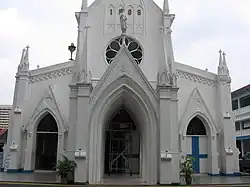 The Church of Our Lady of Lourdes was blessed and officially opened in 1888. This is the first Tamil Catholic church in Singapore. The building site was obtained in 1885 and the cornerstone laid on 1 August 1886 by Bishop Gasnier, D.D. and Sir Frederick A. Weld, G. C M. G in an official ceremony that was witnessed by a number of religious and laity. It bears a resemblance to the Sanctuary of Our Lady of Lourdes, in France. Within the Church building itself is a grotto with life-sized statues depicting the appearance of Our Lady appearing to Saint Bernadette.[1]