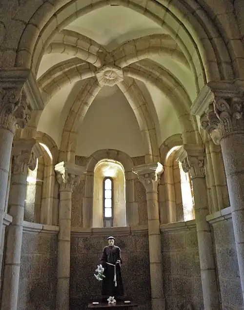 It shows clear influences from the cathedral of Santiago de Compostela in its crown with five radial chapels, which makes it related, despite its size, to the great pilgrimage churches. The radial chapels open to the crown by ogival arches, supported by semi-columns attached to the walls, and are covered with ribbed vaults.