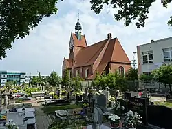 The Church of St. Joseph, Craftsman is a Catholic church in Bydgoszcz, Poland; it is located at 166 Toruńska Street on the northern border of the Wyżyny district. Built as an Evangelical-Union Church for the use of the German community until 1945, it is now now a Catholic church devoted to Saint Joseph the Craftsman. Its parish cemetery covers an area west of the church, delineated by the Toruńska, Władysława Bełzy and Cienista streets. The religious ensemble (church and cemetery) is registered on the Kuyavian-Pomeranian Voivodeship heritage list.