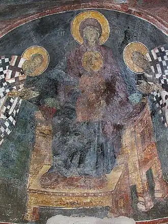 - The smaller dimensions of the building led to a diminished quantity of frescoes in the altar. In it, there is no scene of the Communion of the Apostles. The frescoes from the vault and the triumphal arch – the Ascension of Christ and the Annunciation to the Mother of God – belong to the set of Great Holidays. The conch of the apse contains unusual representations of the Virgin Mary with Christ, enthroned with St. Nicholas and St. Cyril the Philosopher. In the area below is depicted is the Adoration to Christ. In the niche, Christ lies half-naked, dead, and on the walls are three standing figures of Deacons. On the eastern and southern walls are frontal busts of two bishops.[11]