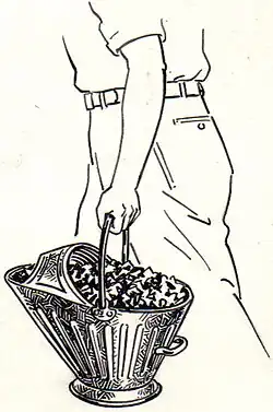 Coal scuttles are usually made of metal and shaped as a vertical cylinder or truncated cone, with the open top slanted for pouring coal on a fire. It may have one or two handles.[1] Homes that do not use coal sometimes use a coal scuttle decoratively.[2]