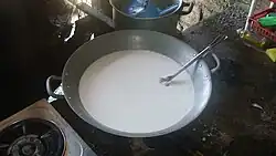 In Malaysia, coconut milk is one of the essential ingredients in a lot of the dishes, this includes a few of the popular dishes in the region, such as the ubiquitous nasi lemak[50] and nasi dagang,[51] rendang,[52] laksa,[53] gulai[54] and Tamil and Mamak style-curry, it is also used in dessert-making such as kuih lapis,[55] kaya[56] and dodol.