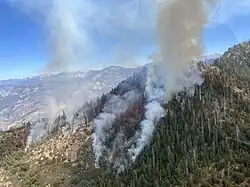 On August 20 the southern portions of the fire had begun to push into the Surprise Grove area,[9][10] and on August 22 an evacuation warning was issued for areas directly west of the Sequoia National Park.[11][12] The fire reached 2,683 acres (1,086 ha) in size the following day, and crews conducted aerial firefighting operations.[12] On August 24 the number of personnel assigned to the fire increased to 918,[13] and by August 28 the number had again increased to 1,312.[14] On August 29 the fire had grown to 5,683 acres (2,300 ha) in coverage,[15] and the fire began to push toward the Kaweah River.[15] Containment on the fire reached 11% for the first time on August 31 as several fire lines were completed.[16][17][1]