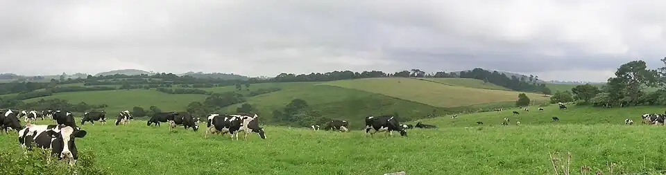 The annual average rainfall at Comboyne is a high 1818 mm.[7] The climate is sub tropical, though at an elevation of 588 metres, it is cooler than at the coast nearby. Soils are derived from basalt, which provide a deep red loam. Below the basalt are less fertile sedimentary rocks. The Comboyne Shield Volcano erupted some 11 to 13 million years ago.[8] The Comboyne plateau is a scarp-bounded paleoplain located between the central north coast of New South Wales and the Great Dividing Range. Miocene basalts overlie much of the plateau, creating relatively fertile red/brown soils.[9] In the southern third of the plateau are underlying Triassic sediments of the Lorne basin.[5] The plateau has a wet, sub tropical climate,[10] though subject to frost and occasional snow.