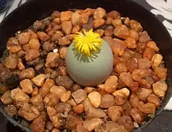 Rounded ball-shaped succulent plant, that divides to form dense clumps. The resemblance to pebbles and the firmness of its flesh is what got it its name ("calculus" is Latin for "pebble"). It produces yellow or orange flowers in autumn, that open at night, and have the aroma of cloves.
