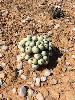 The ball shape is formed from the plant's leaf-pair having fused entirely, leaving only a tiny slit at the top, where the flower and the succeeding leaf pair pushes through. The new leaf-pair forms inside the ball. When it is ready, the ball of the old leaf-pair shrivels and dries out, before it is split open by the new leaf-pair ball. The epidermis (and therefore the dried leaf sheath too) is thick and strong.