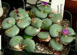 Conophytum wettsteinii is a species of flowering plant in the genus Conophytum, native to the northwest Cape Provinces of South Africa.[3] It is known to grow in rocky regions, often associated with Crassula elegans. C. wettsteinii is a small groundcover species, which appears stemless with fused leaf-pairs having a obconical shape. This plant relies on winter rains and is mainly dormant in summer months. Best growth occurs when drainage is available, and when only shaded during mid-summer. Propegation can occur through seeds or through cuttings from a full grown plant, where each cutting contains at least 1 head and a fraction of root.[4] It has gained the Royal Horticultural Society's Award of Garden Merit.[5]