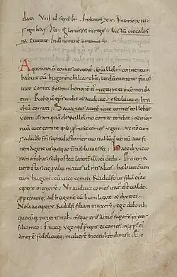 The Conventum is unlike any other text from 11th-century France and its genre has been a matter of debate. It is untitled in all manuscripts.[17] The full form of the title assigned it by Labbe is Conventio inter Willelmum ducem Aquitaniae et Hugonem chiliarchum, revised by Martindale to Conventum inter Guillelmum comitem Aquitanorum et Hugonem chiliarchum.[18] The explicit of the text reads, in capitals, FINIUNT CONVENTI INTER COMITEM ET UGONEM, which led Jean Besly to entitle it Conventum inter comitem et Ugonem.[19] The simple conventional title, Conventum, implies that it is a formal memorandum of settlement between William and Hugh.[17] In her edition, Martindale called it "the unique surviving example from the early eleventh century of a written settlement between man and lord."[20] It is similar to the formal convenientia, but cannot be classified as one.[21] It lacks the formal and authenticating elements of charters and is much longer than a typical convenientia.[17] The terms conventum and convenientia do, however, appear in the text.[22][21]