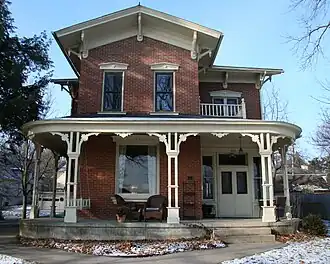 The significance of this house is its architectural combination of the Italianate and Neoclassical styles, and its association with two prominent Decorah bankers.[2] It was designed by local architect H. O. Ball, and built in 1867 by Wilson, Robertson & Company, a local contractor. The two-story, brick house features bracketed eaves, a wooden cornice, and a wrap-around bracketed porch. It was built for E. E. Cooley, an attorney who helped establish the First National Bank of Decorah. He was also involved with local politics. After his death in 1895, the house became the home of Lewis B. Whitney. He was the former Winneshiek County Treasurer who was one of the organizers of the National Bank of Decorah.