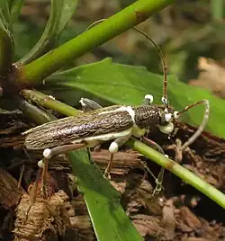 B. bassiana is a white mould when grown on culture, producing white spore balls made up of many conidia that are single-celled, haploid, and hydrophobic.[8][9] The short, ovoid conidiogenous cells that produce the conidia have a narrow apical extension called a rachis, which elongates into a long zig-zag extension.[10][9]