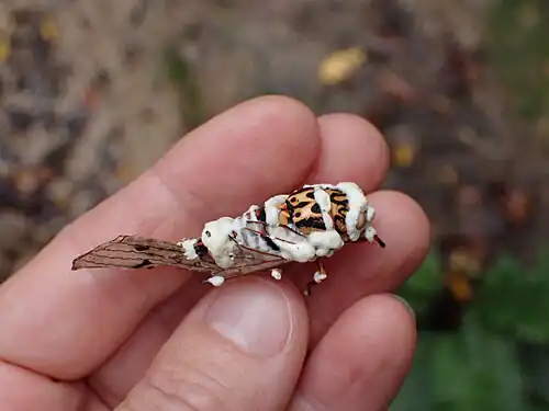 Spotted in St. Tammany Parish, Louisiana, a Golden silk orb-weaver dead from white muscardine disease with white mold emerging from the cadaver's joints and pores.
