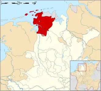 ![]() Map of the County of East Frisia in the Lower Rhenish–Westphalian Circle around 1560 | |||||||||||||||||||||||||||||