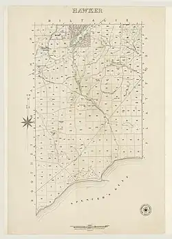 The Hundred of Hawker (33°43′31″S 136°45′20″E / 33.725170°S 136.755550°E / -33.725170; 136.755550 (Hundred of Hawker)) was proclaimed on 24 January 1878. It covers an area of 380 square kilometres (147 sq mi) and was named after George Charles Hawker, a former member of the South Australian Parliament. It is located almost entirely within the locality of Cowell with a portion on the Spencer Gulf coastline being in the locality of Port Gibbon.[25][15]
