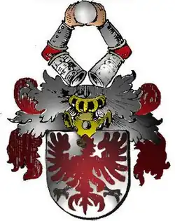 The von Creuzburg coat of arms consists of a red eagle on a silver field. On the helmet, two red arms dressed in silver hold a silver ball. The helmet covers are silver and red.