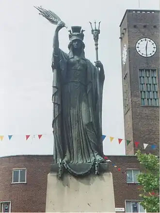 Following the First World War, the people of Crewe were slow to approve plans for the erection of a monument to the town's 700 soldiers who had fallen in the combat. The town already had a war memorial, the Boer War Memorial, which had been erected in Queen's Park in 1902–03. It was hoped that there could be a joint monument with the London and North Western Railway, the main employers and land owners in the town, but they already had their own monument at Euston station in London. Eventually the council's War Memorial Sub-Committee decided in 1922 to erect a monument in Market Square. This was to be financed by public subscription, and it was hoped that the railway company would contribute to the cost. Seven models were submitted for consideration, and the committee chose the one designed by Walter Gilbert depicting a figure of Britannia in bronze.[1] Gilbert was the art director of the founders Martyns of Cheltenham, who were commissioned to cast the sculpture.[1]