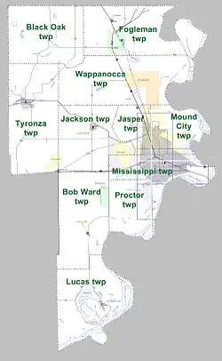 Townships in Arkansas are the divisions of a county. Each township includes unincorporated areas; some may have incorporated cities or towns within part of their boundaries. Arkansas townships have limited purposes in modern times. However, the United States census does list Arkansas population based on townships (sometimes referred to as "county subdivisions" or "minor civil divisions"). Townships are also of value for historical purposes in terms of genealogical research. Each town or city is within one or more townships in an Arkansas county based on census maps and publications. The townships of Crittenden County are listed below; listed in parentheses are the cities, towns, and/or census-designated places that are fully or partially inside the township. [40][41]