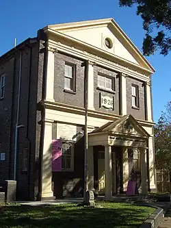 By 1820 a large part of the area had been subsumed by Joseph Underwood's large 'Ashfield Park Estate'. This property remained largely intact for more than 40 years, until it was subdivided into large blocks after the death of Elizabeth Underwood in 1858. By this time its proximity to the railway made it a desirable area (the station was originally called Fivedock).[9] One of these subdivisions was the 'Highbury Estate', on part of which Anthony Hordern, son of the founder of the great retail firm, Anthony Hordern & Sons, eventually built his house 'Shubra Hall', just beyond the west border of Ashfield. It later became part of the Presbyterian Ladies' College, the current boundaries of which give an idea of the extent of the Hordern property.[8] The College, including Shubra Hall, the main school building and the Meta Street entrance gates, is now listed on the Register of the National Estate.[10]
